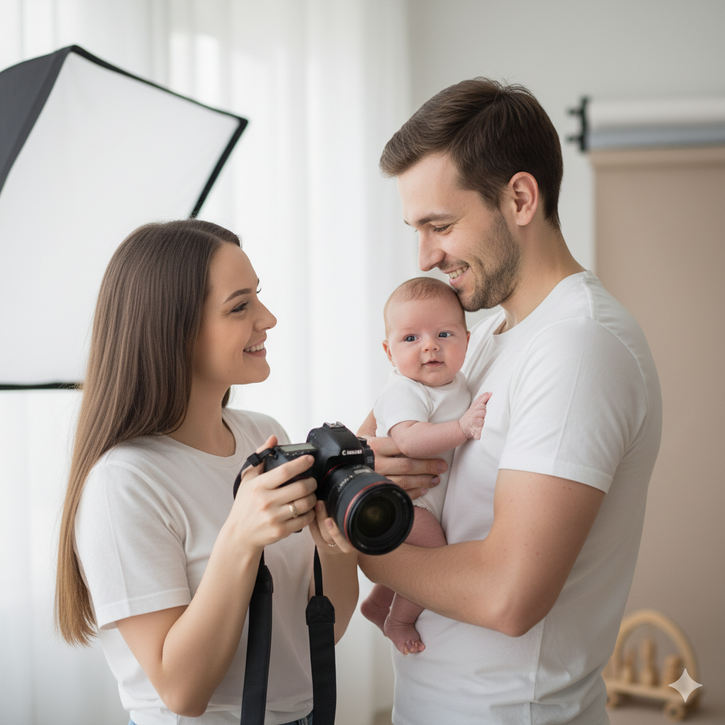写真館での記念撮影は、プロの技術でその瞬間の「空気感」まで切り取ってくれます。奥さんも赤ちゃんも、そしてパパも一緒に写ることで、家族の絆が深まる素敵な思い出になりますよ。